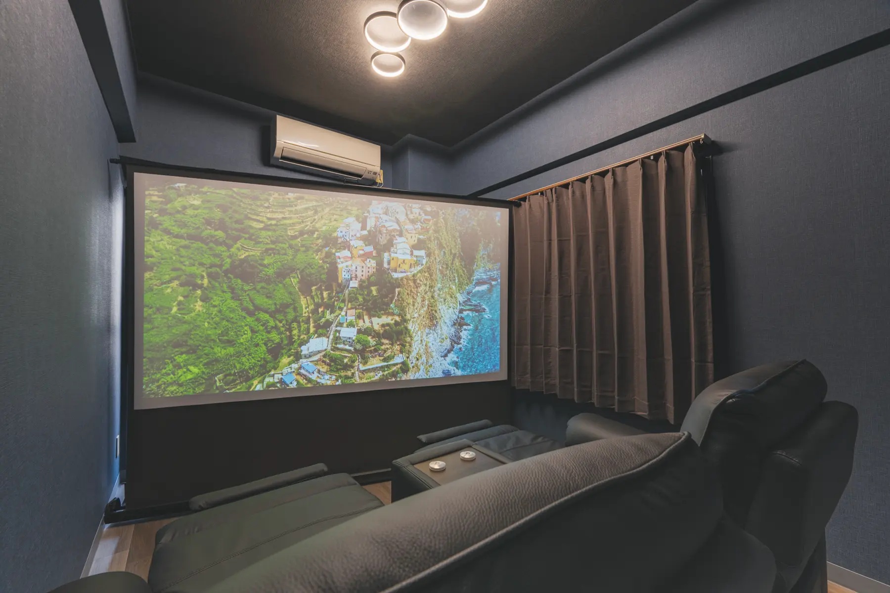 大迫力プロジェクターでおうち映画館に大変身!リクライニングソファと間接照明でくつろいだ時間を過ごせます。